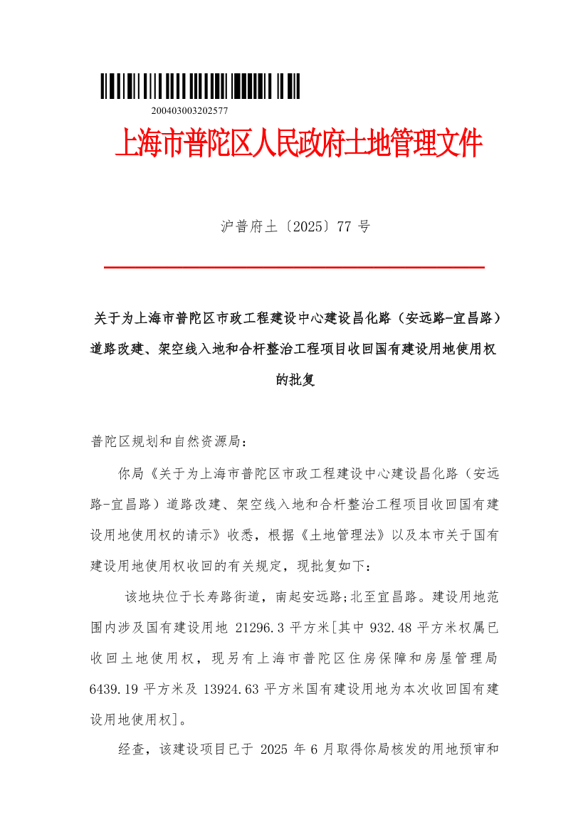 关于为上海市普陀区市政工程建设中心建设昌化路(安远路-宜昌路)道路改建、架空线入地和合杆整治工程项目收回国有建设用地使用权的批复