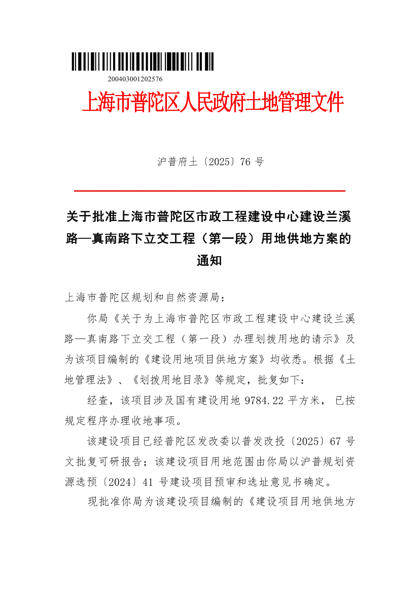 现批准你局为该建设项目编制的《建设项目用地供地方案》,该项目供地面积为 9784.22 平方米,以划拨方式供地,土地用途为城镇村道路用地,由上海市普陀区市政工程建设中心建设兰溪路—真南路下立交工程(第一段)。