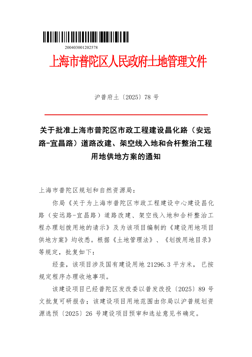 关于批准上海市普陀区市政工程建设昌化路(安远路-宜昌路)道路改建、架空线入地和合杆整治工程用地供地方案的通知