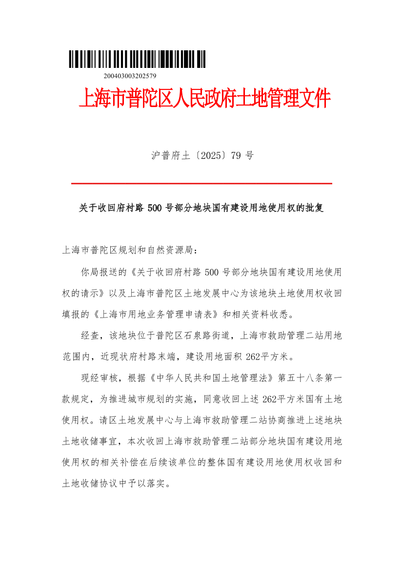 你局报送的《关于收回府村路500号部分地块国有建设用地使用权的请示》以及上海市普陀区土地发展中心为该地块土地使用权收回填报的《上海市用地业务管理申请表》和相关资料收悉。