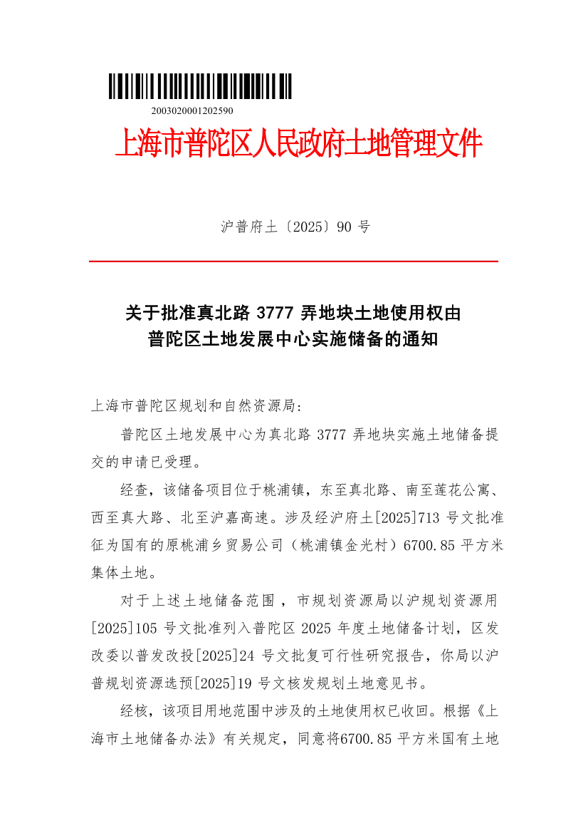 关于批准真北路3777弄地块土地使用权由普陀区土地发展中心实施储备的通知