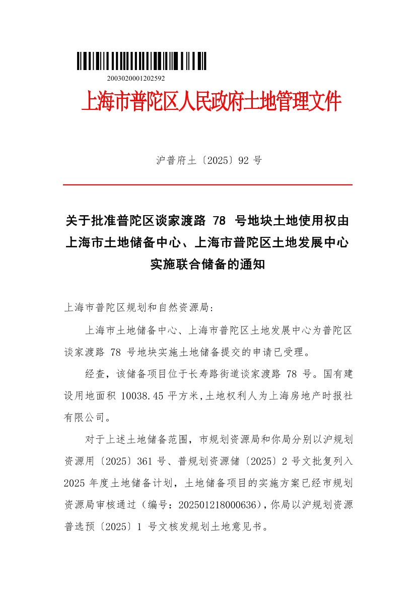 关于批准普陀区谈家渡路78号地块土地使用权由上海市土地储备中心、上海市普陀区土地发展中心实施联合储备的通知