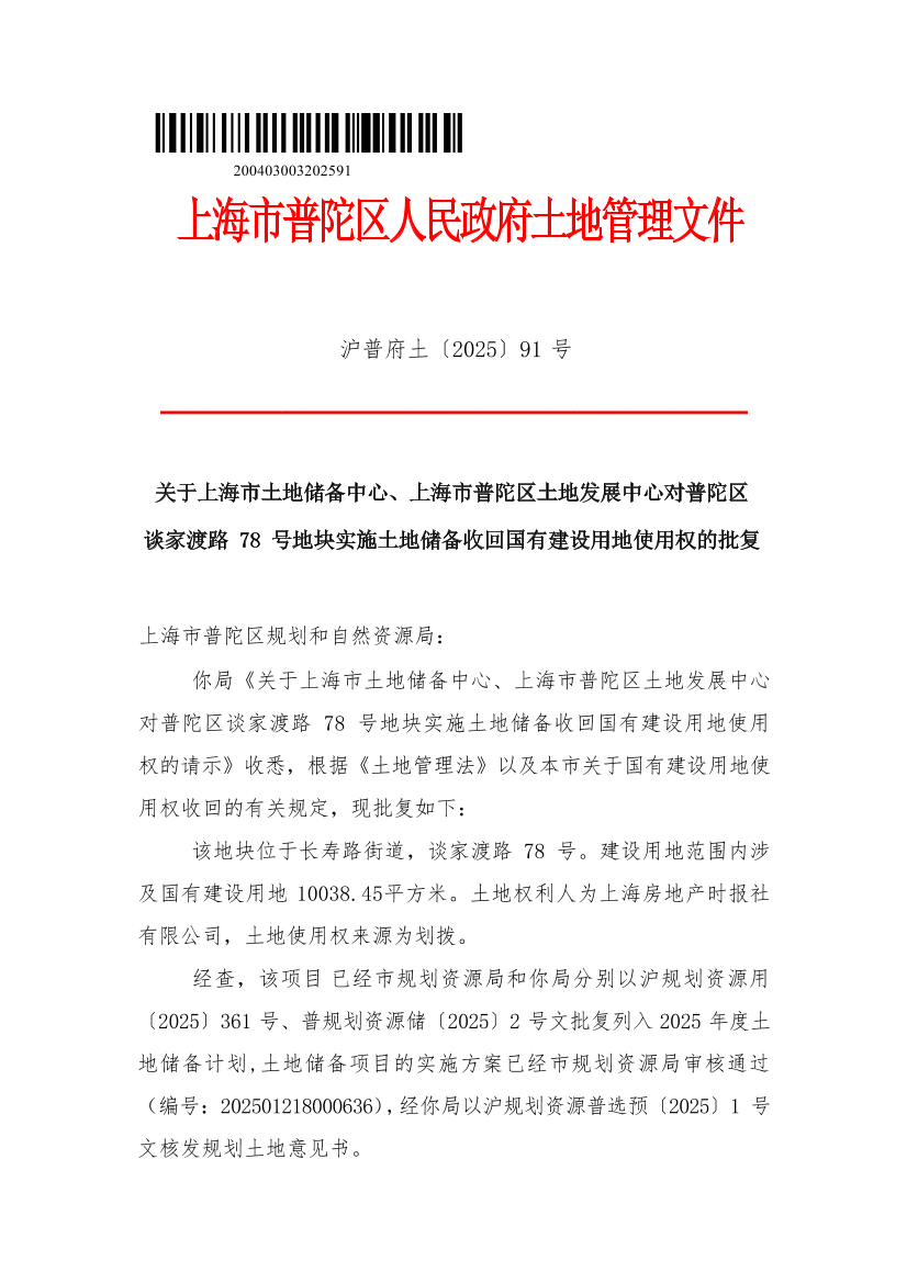 关于上海市土地储备中心、上海市普陀区土地发展中心对普陀区谈家渡路78号地块实施土地储备收回国有建设用地使用权的批复
