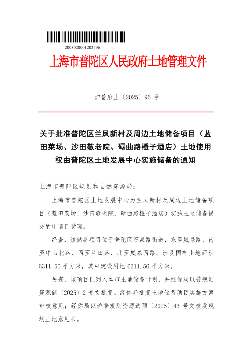 另查,该项目已列入本市土地储备计划,并经你局以普规划资源储〔2025〕2号文批复。经你局批复土地储备项目实施方案审核意见;经你局以沪普规划资源选预〔2025〕43号文核发规划土地意见书。
