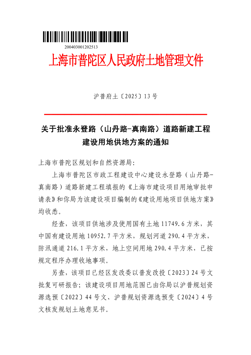 批准你局为该建设项目编制的《建设用地项目供地方案》,该项目供地面积为11243.1平方米(其中290.4平方米为地上空间),由上海市普陀区市政工程建设中心建设永登路( 山丹路-真南路)道路新建工程,以划拨方式供地,土地用途为城镇村道路用地。其余属退让规划河道290.4平方米及防汛通道216.1平方米,由普陀区土地管理部门作为国有土地管理。