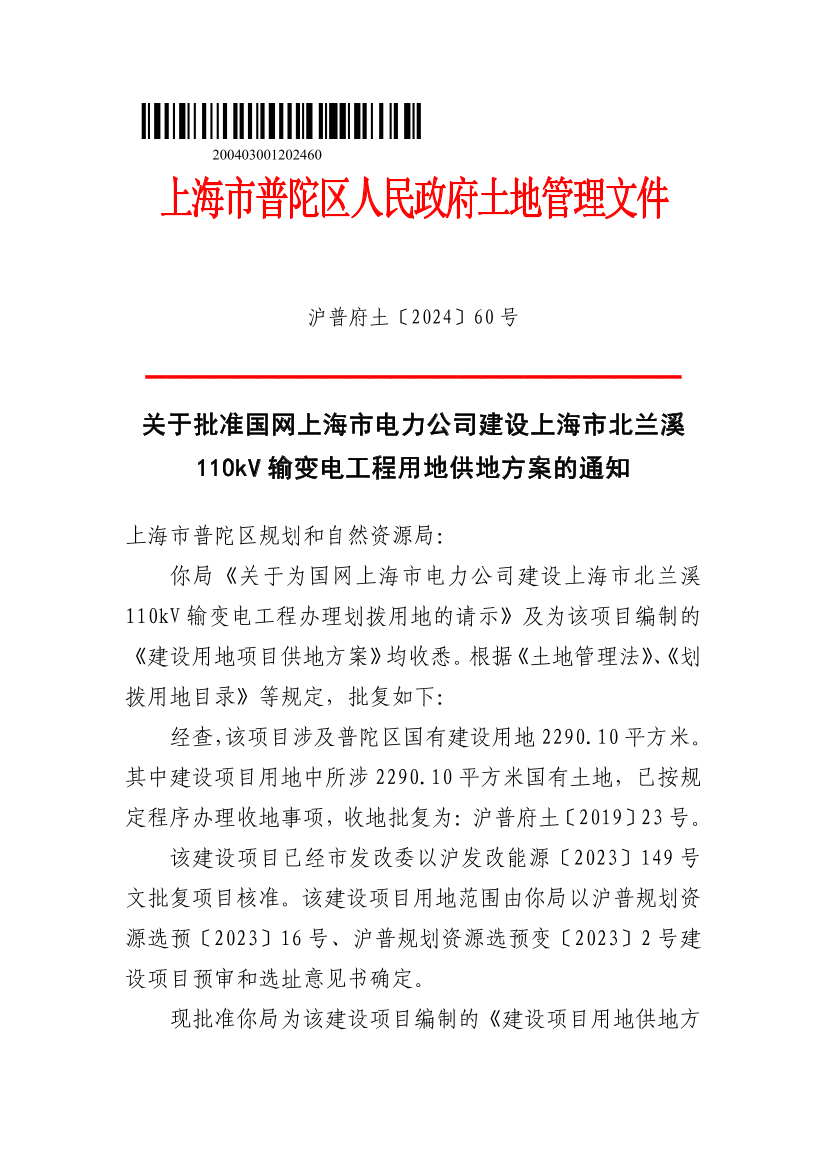 现批准你局为该建设项目编制的《建设项目用地供地方案》,该项目供地面积2290.10平方米,以划拨方式供地,土地用途为公用设施用地,由国网上海市电力公司建设上海市北兰溪110kV输变电工程。