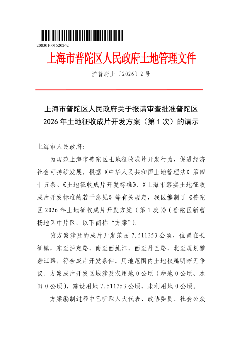 上海市普陀区人民政府关于报请审查批准普陀区2026年土地征收成片开发方案(第1次)的请示