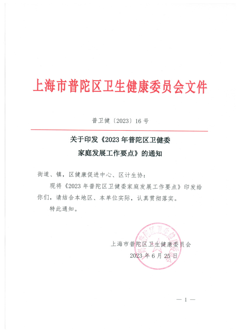 关于印发《2023年普陀区卫健委家庭发展工作要点》的通知