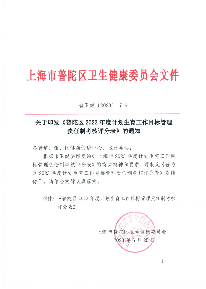 关于印发《普陀区2023年度计划生育工作目标管理责任制考核评分表》的通知