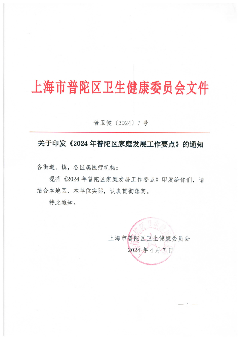 关于印发《2024年普陀区家庭发展工作要点》的通知