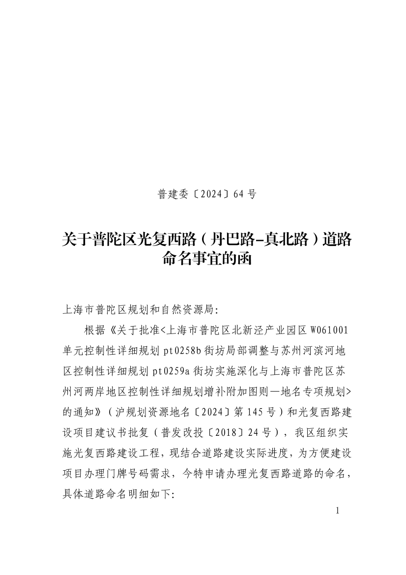 根据《关于批准<上海市普陀区北新泾产业园区W061001单元控制性详细规划pt0258b街坊局部调整与苏州河滨河地区控制性详细规划pt0259a街坊实施深化与上海市普陀区苏州河两岸地区控制性详细规划增补附加图则—地名专项规划>的通知》(沪规划资源地名〔2024〕第145号)和光复西路建设项目建议书批复(普发改投〔2018〕24号),我区组织实施光复西路建设工程,现结合道路建设实际进度,为方便建设项目办理门牌号码需求,今特申请办理光复西路道路的命名,具体道路命名明细如下:
