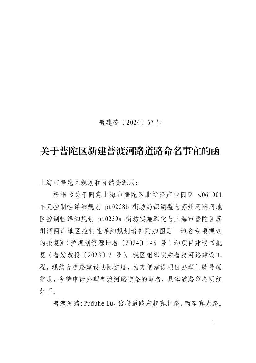 根据《关于同意上海市普陀区北新泾产业园区 w061001单元控制性详细规划pt0258b街坊局部调整与苏州河滨河地区控制性详细规划pt0259a街坊实施深化与上海市普陀区苏州河两岸地区控制性详细规划增补附加图则—地名专项规划的批复》(沪规划资源地名〔2024〕145号)和项目建议书批复(普发改投〔2023〕7号),我区组织实施普渡河路建设工程,现结合道路建设实际进度,为方便建设项目办理门牌号码需求,今特申请办理普渡河路道路的命名,具体道路命名明细如下: