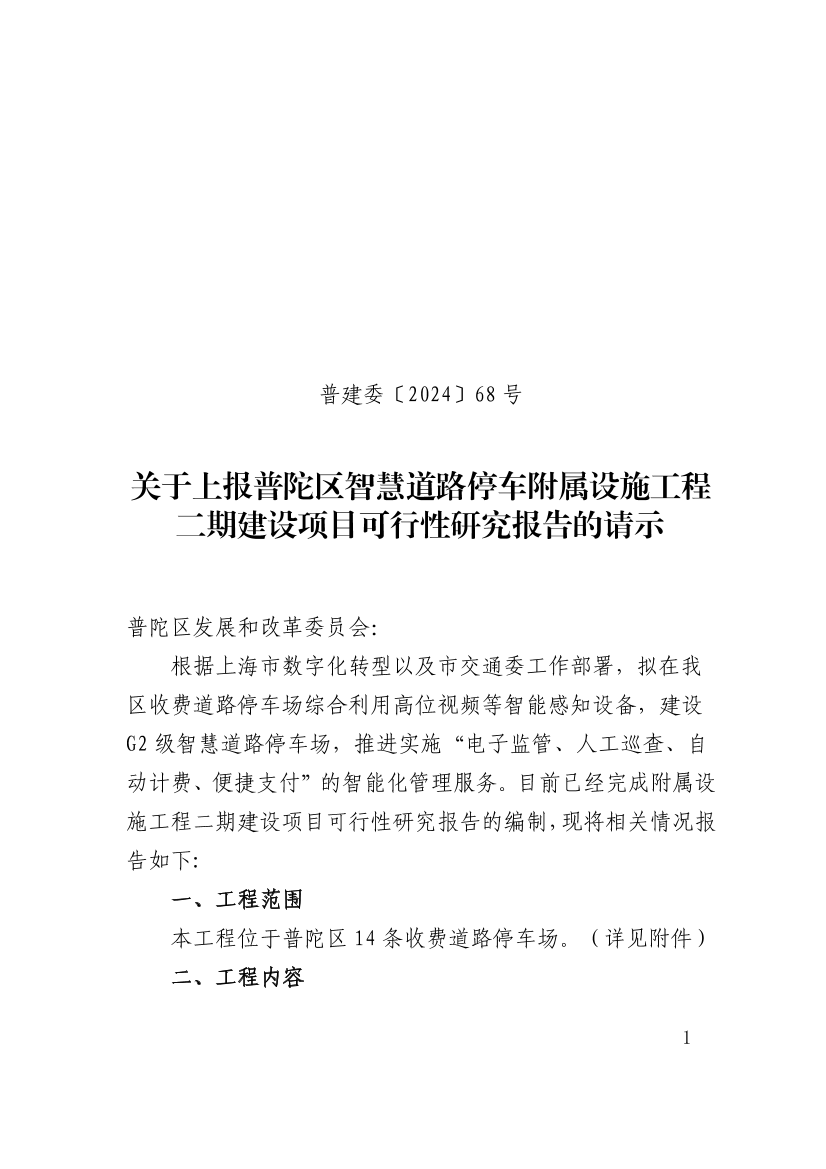 关于上报普陀区智慧道路停车附属设施工程二期建设项目可行性研究报告的请示