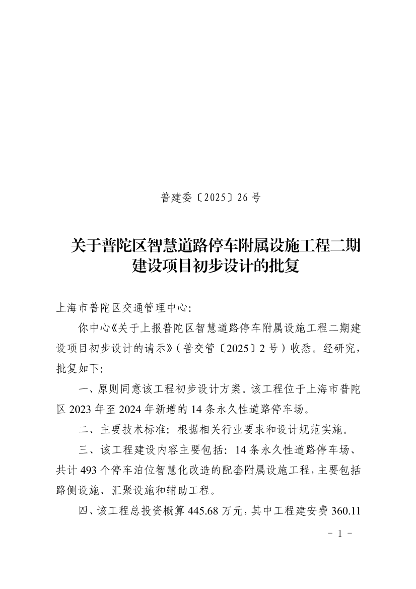 你中心《关于上报普陀区智慧道路停车附属设施工程二期建设项目初步设计的请示》(普交管〔2025〕2号)收悉。经研究,批复如下: