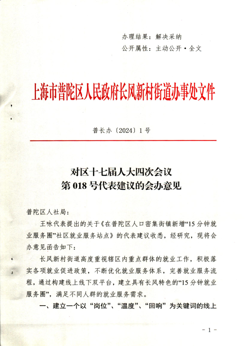 王咏代表提出的关于《在普陀区人口密集街镇新增“15分钟就业服务圈”社区就业服务站点》的代表建议收悉,经研究,现将会办意见函告如下: