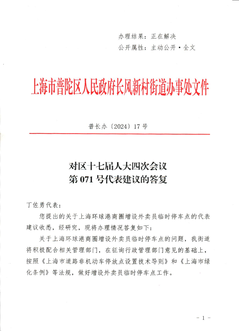 您提出的关于上海环球港商圈增设外卖员临时停车点的代表建议收悉,经研究,现将办理情况答复如下: