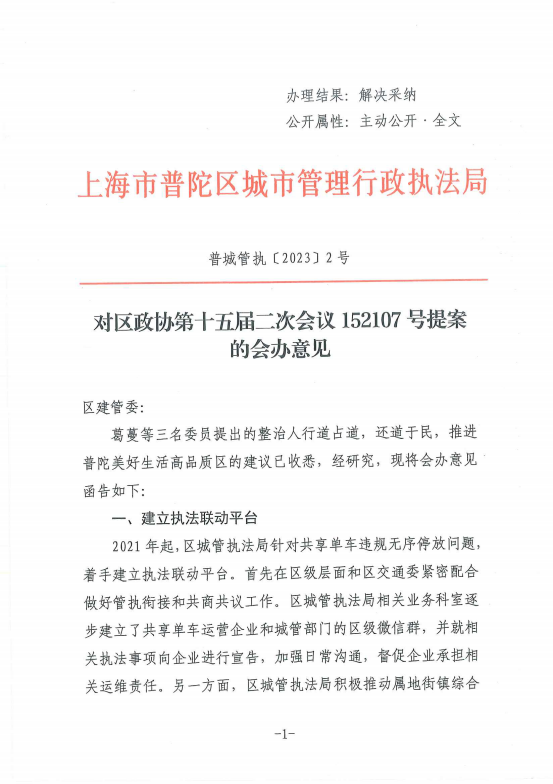 葛蔓等三名委员提出的整治人行道占道,还道于民,推进普陀美好生活高品质区的建议已收悉,经研究,现将会办意见函告如下: