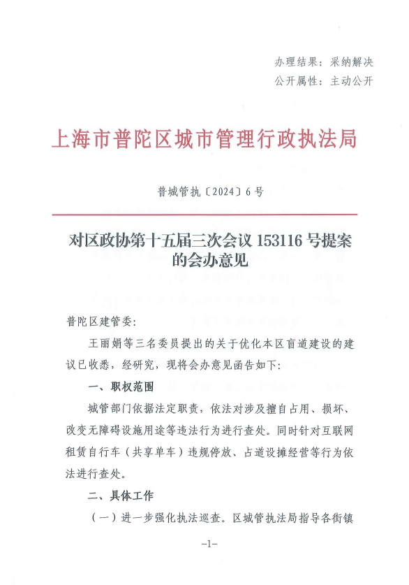 王丽娟等三名委员提出的关于优化本区盲道建设的建议已收悉,经研究,现将会办意见函告如下:
