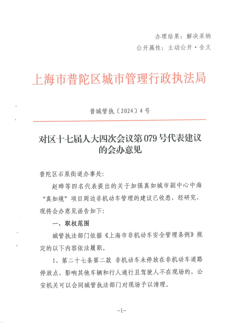 赵晔等四名代表提出的关于加强真如城市副中心中海“真如境”项目周边非机动车管理的建议已收悉,经研究,现将会办意见函告如下: