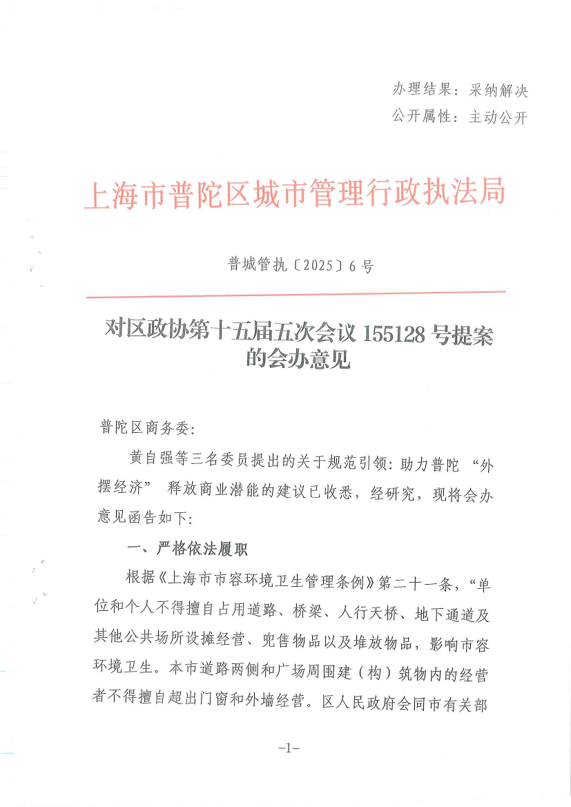 黄自强等三名委员提出的关于规范引领:助力普陀 “外摆经济” 释放商业潜能的建议已收悉,经研究,现将会办意见函告如下: