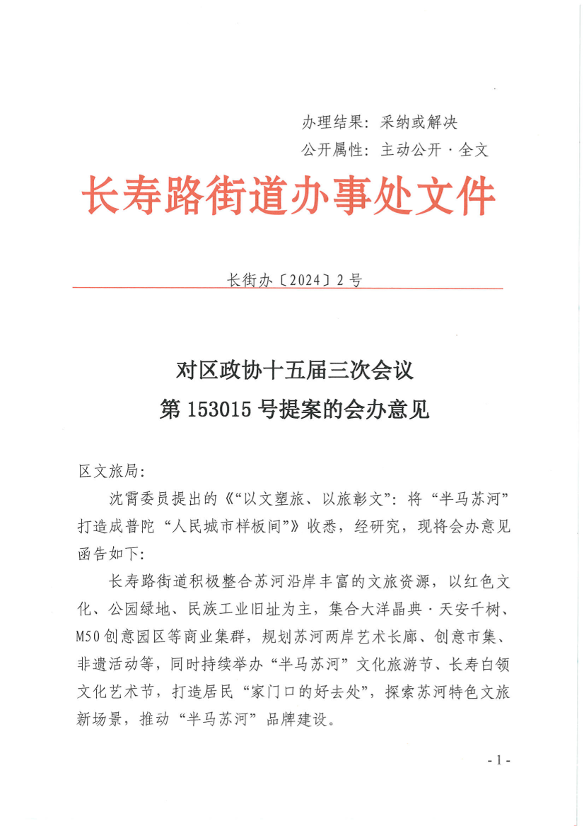 沈霄委员提出的《“以文塑旅、以旅彰文”:将“半马苏河”打造成普陀“人民城市样板间”》收悉,经研究,现将会办意见函告如下: