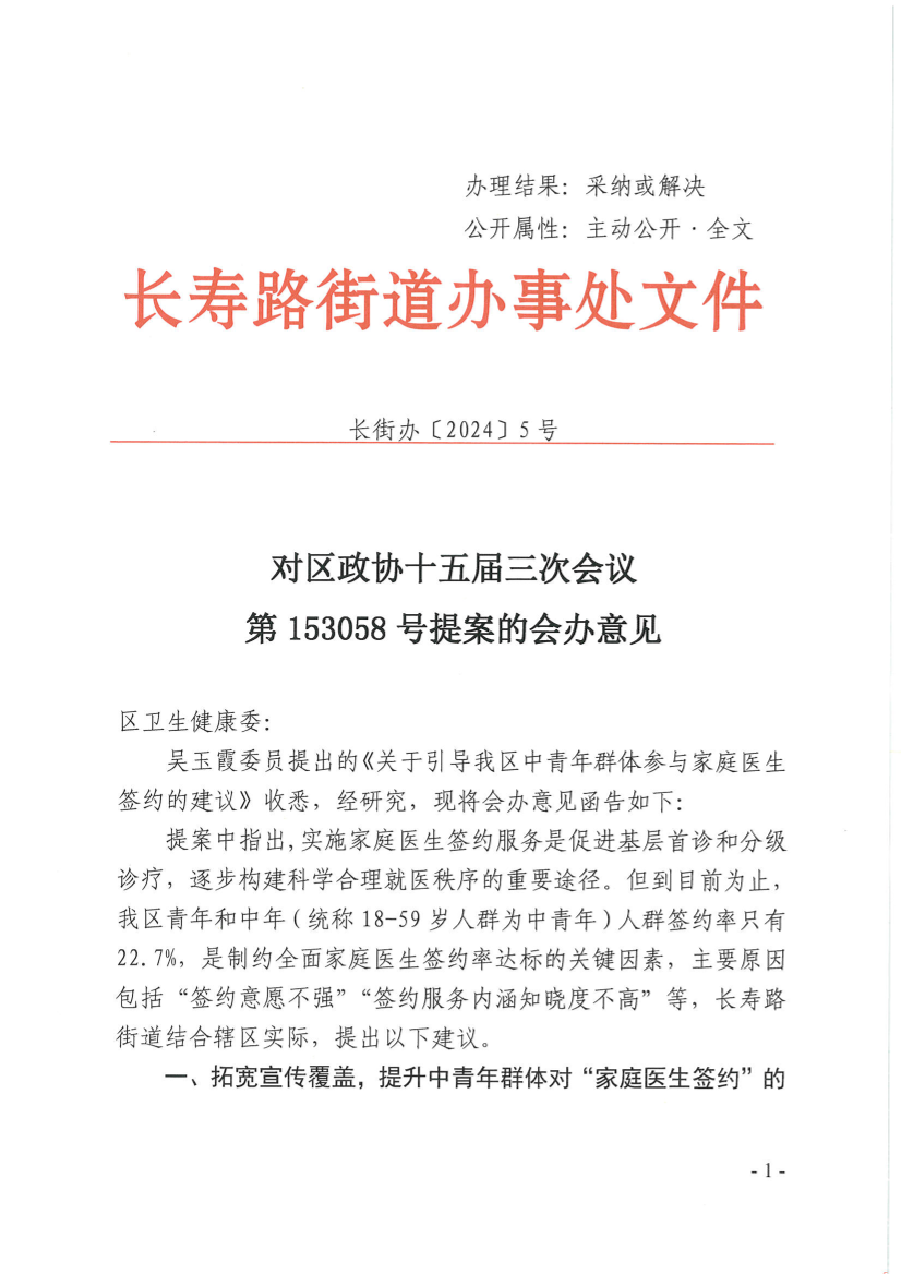 吴玉霞委员提出的《关于引导我区中青年群体参与家庭医生签约的建议》收悉,经研究,现将会办意见函告如下: