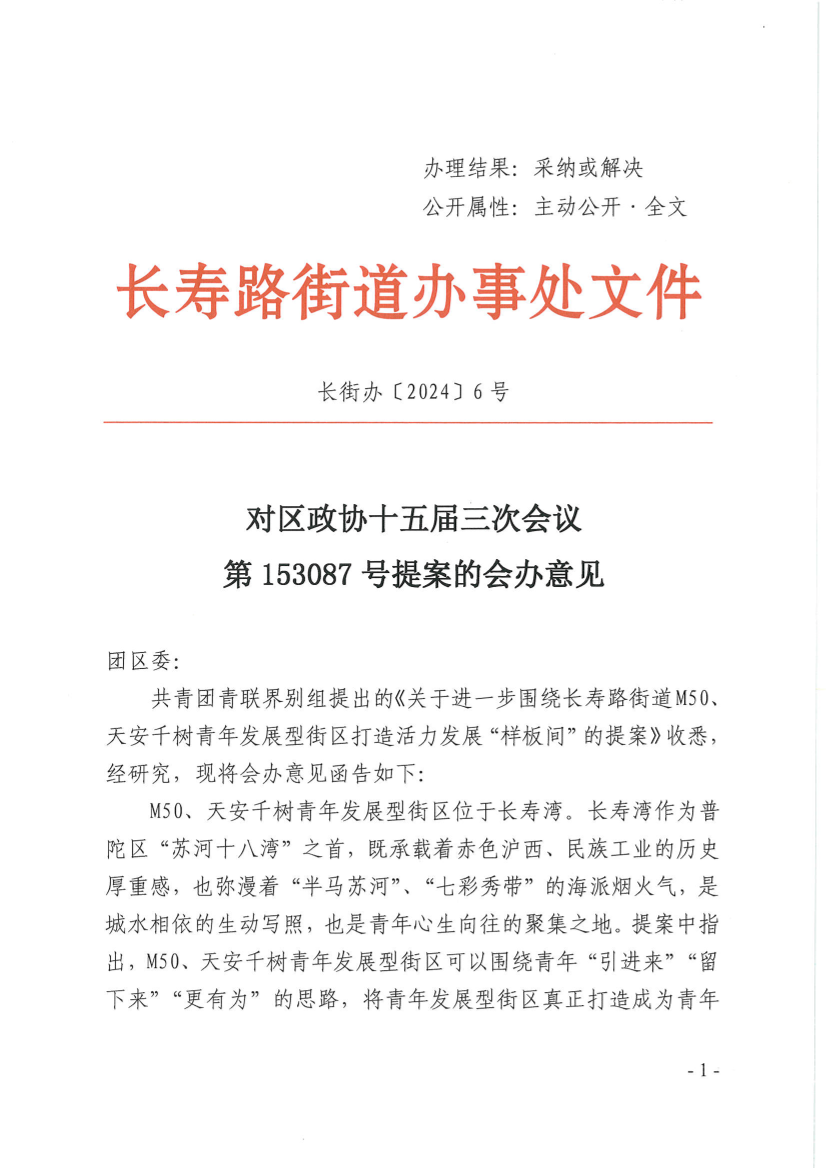共青团青联界别组提出的《关于进一步围绕长寿路街道M50、天安千树青年发展型街区打造活力发展“样板间”的提案》收悉,经研究,现将会办意见函告如下: