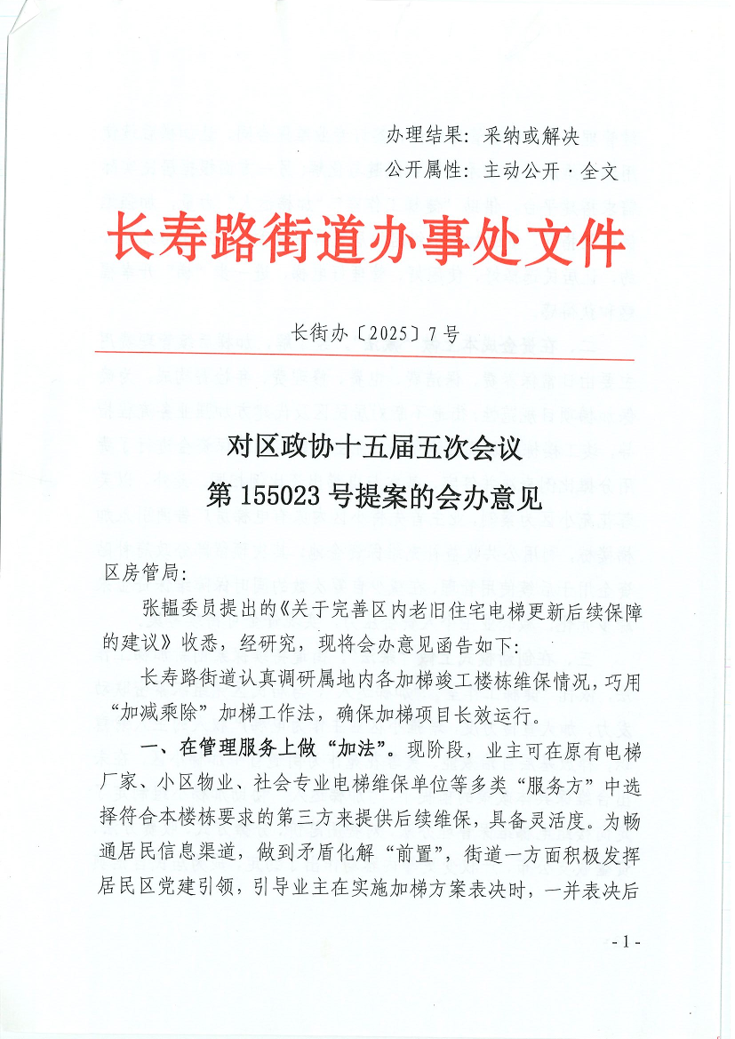 张韫委员提出的《关于完善区内老旧住宅电梯更新后续保障的建议》收悉,经研究,现将会办意见函告如下: