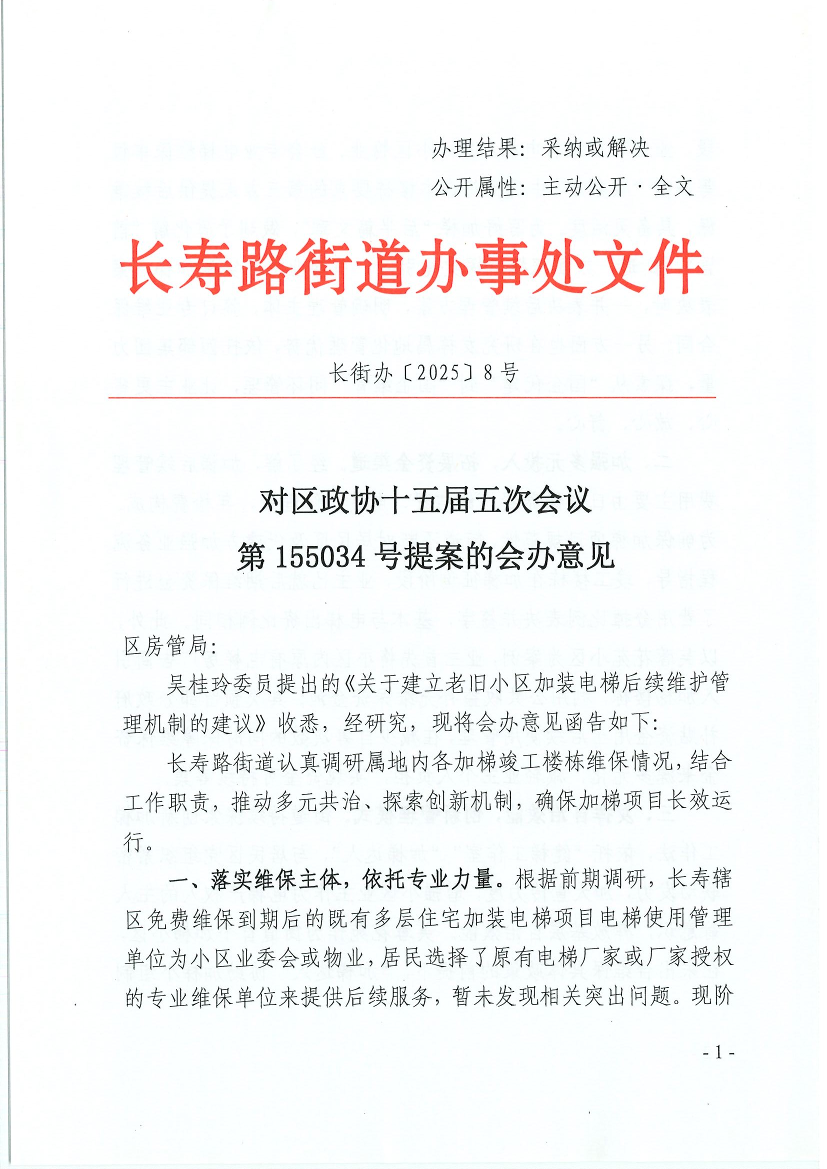 吴桂玲委员提出的《关于建立老旧小区加装电梯后续维护管理机制的建议》收悉,经研究,现将会办意见函告如下: