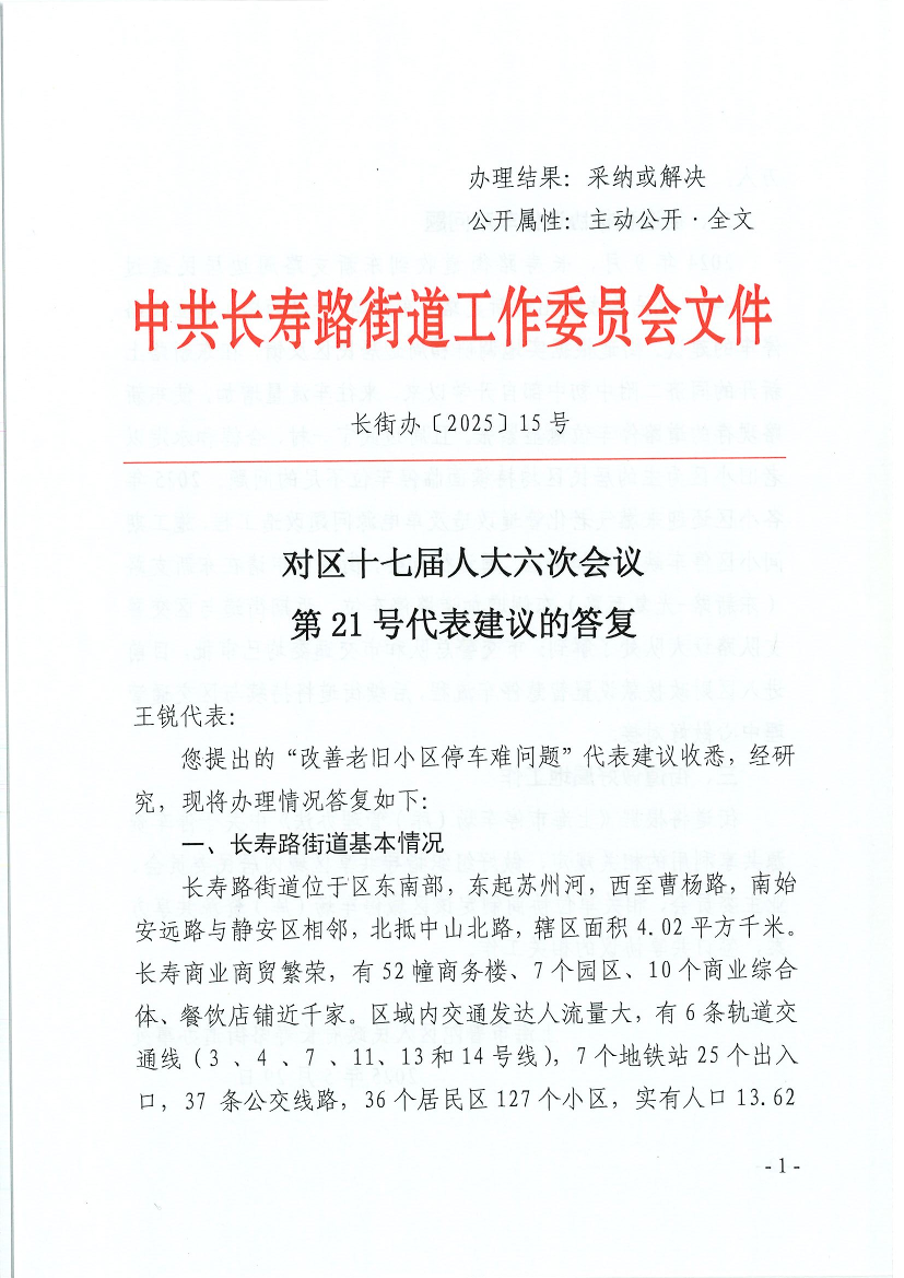 您提出的“改善老旧小区停车难问题”代表建议收悉,经研究,现将办理情况答复如下: