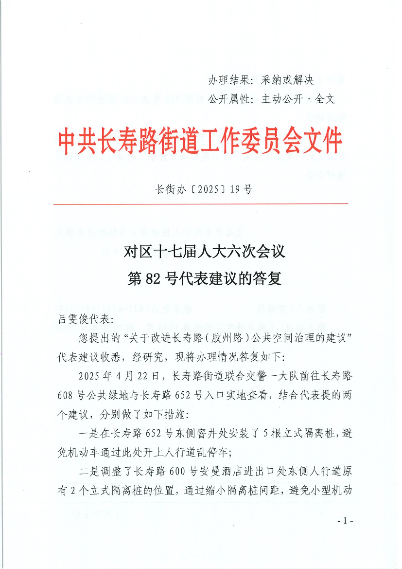 您提出的“关于改进长寿路(胶州路)公共空间治理的建议”代表建议收悉,经研究,现将办理情况答复如下: