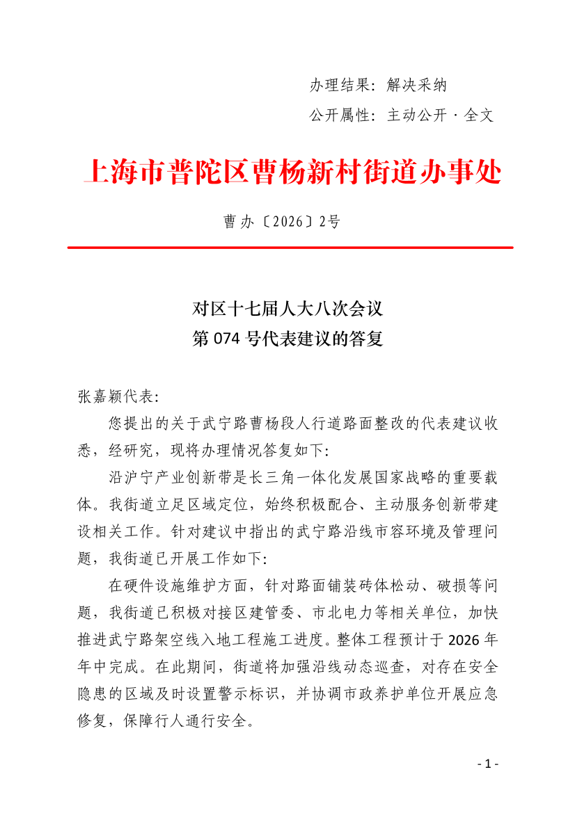 您提出的关于武宁路曹杨段人行道路面整改的代表建议收悉,经研究,现将办理情况答复如下: