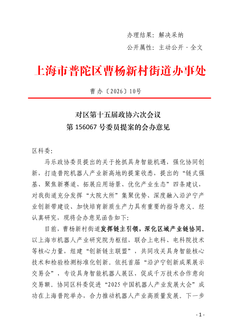 马乐政协委员提出的关于抢抓具身智能机遇,强化协同创新,打造普陀机器人产业新高地的提案收悉,提出的“链式强基、聚焦新赛道、拓展应用场景、优化产业生态”四条建议,对我街道充分发挥“大院大所”集聚优势、深度融入沿沪宁产业创新带建设、加快培育新质生产力具有重要的指导意义。经认真研究,现将会办意见函告如下: