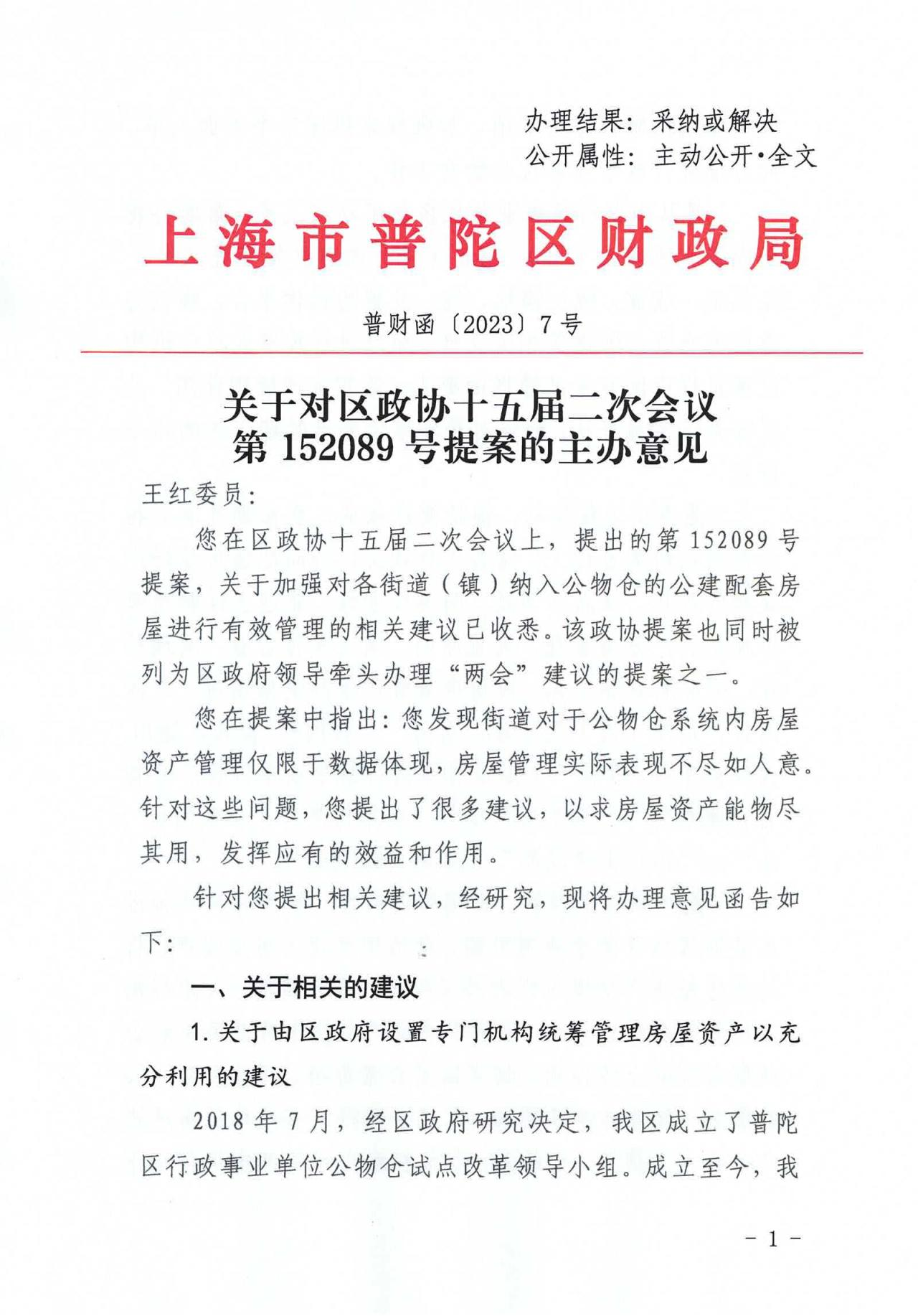 关于对区政协十五届二次会议第152089号提案的主办意见