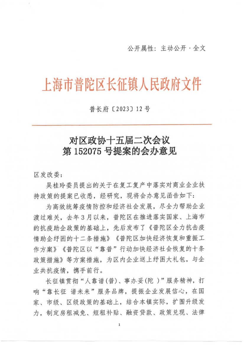 对区政协十五届二次会议第152075号提案的会办意见