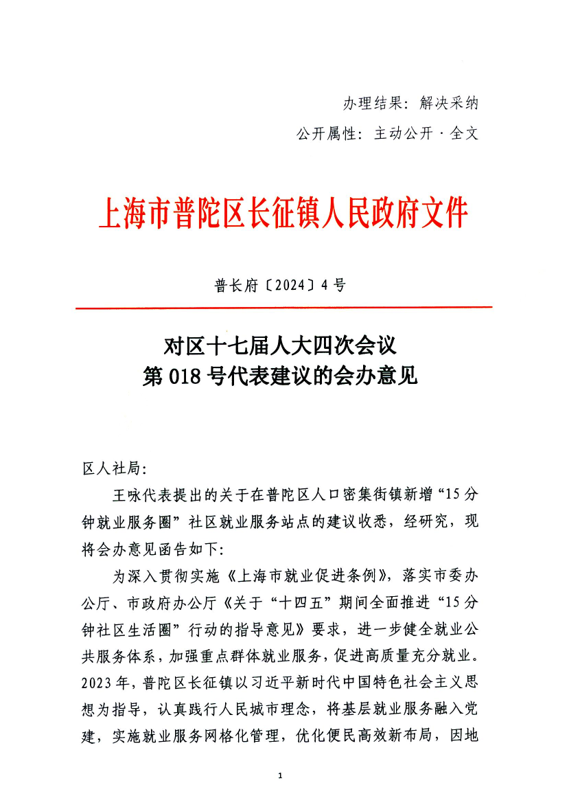 王咏代表提出的关于在普陀区人口密集街镇新增“15分钟就业服务圈”社区就业服务站点的建议收悉,经研究,现将会办意见函告如下: