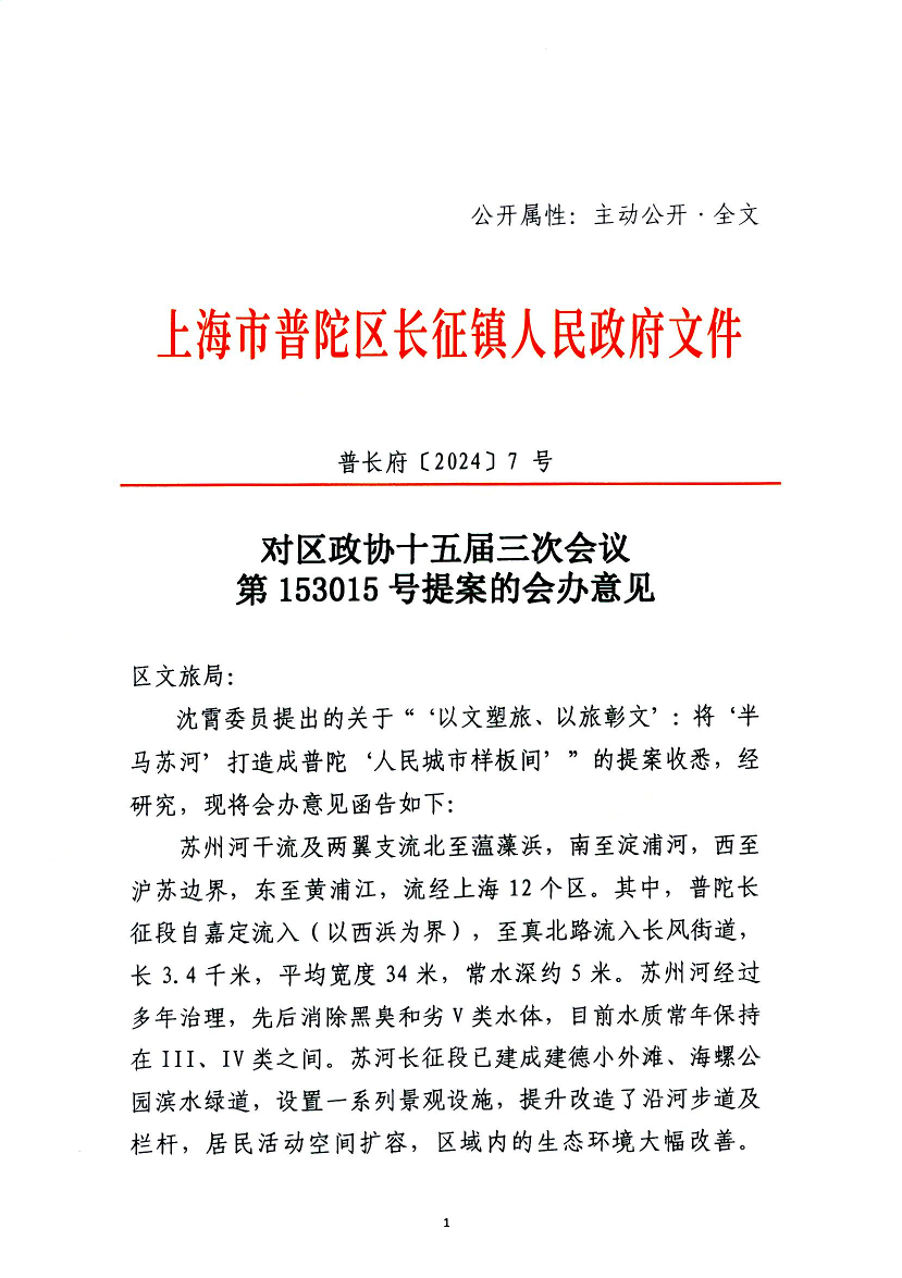 沈霄委员提出的关于“‘以文塑旅、以旅彰文’:将‘半马苏河’打造成普陀‘人民城市样板间’”的提案收悉,经研究,现将会办意见函告如下: