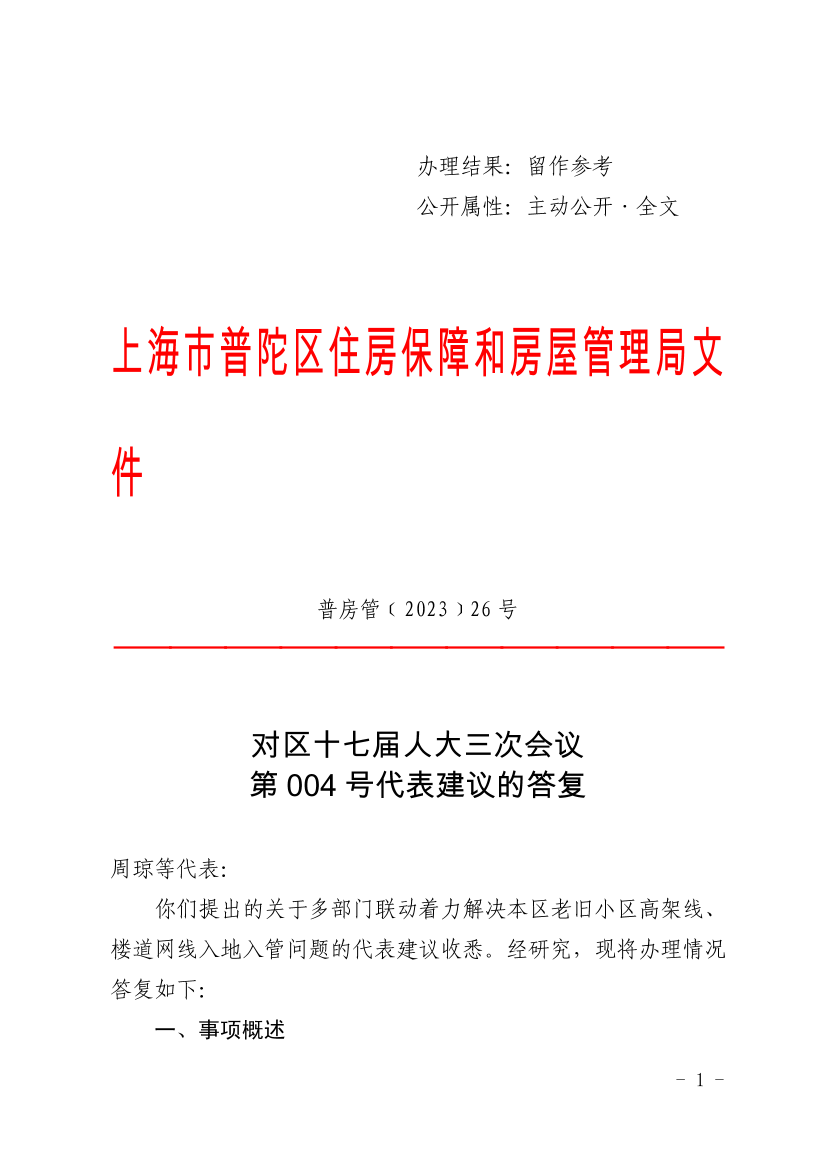 普陀区在“创新发展活力区、美好生活品质区”的过程中,着力扩大城市更新覆盖面,努力提升居民百姓获得感,社区功能和城市颜值得到了很大增强。因此,进一步加快做好修缮改造后各家弱电运营商架空管线割接入地工作,对加强“人民城市”建设,落实小区品质提升“最后一公里”具有十分重要的意义。一方面,我局将会继续向市局反映此类问题,并积极配合市局各级住宅修缮部门协商建立割接工作综合协调机制;另一方面,我局也提请市级层面的部门牵头协调上海市通信管理局和东方有线主管单位等职能部门,尽快制定老旧小区架空线缆割接的时间表和任务书;要以对城市安全运行和人民群众极端负责的态度,对已完成小区内地下弱电管网敷设的小区每年排定工作目标,尽快消除小区空中“黑色污染”。