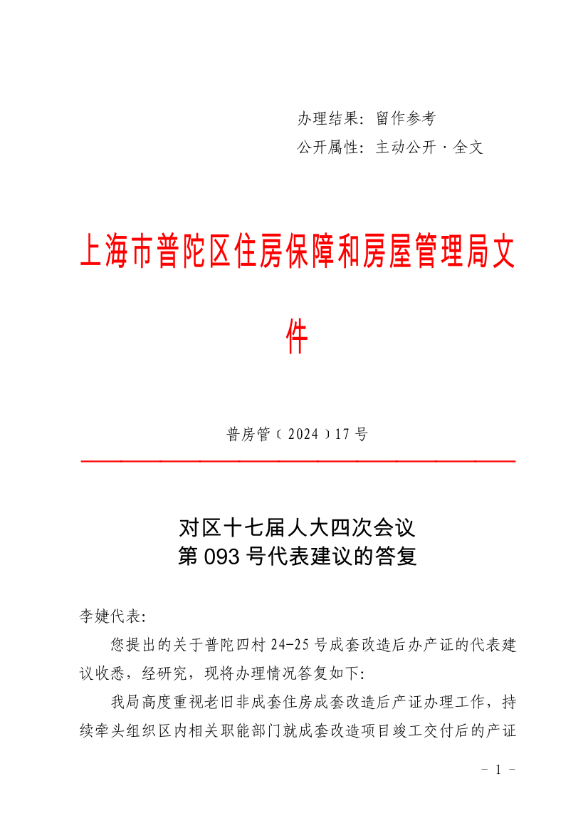 您提出的关于普陀四村24-25号成套改造后办产证的代表建议收悉,经研究,现将办理情况答复如下: