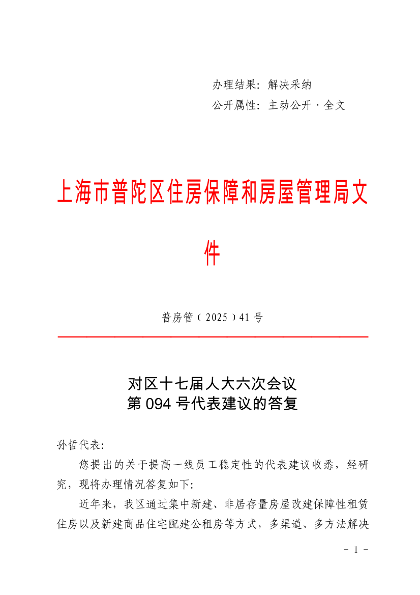 “十四五”以来,普陀区践行人民城市理念,区委、区政府始终高度重视保障性租赁住房建设筹措工作,在市住建委、市房管局的关心指导下,不断加大保障性租赁住房建设筹措力度,加快构建“一套房、一间房、一张床”的多层次租赁住房供应体系。“十四五”期间,我区将完成筹措保障性租赁住房32488套(间),供应21409套(间)。截至2024年年底,已累计完成建设筹措保障性租赁住房27414套(间),累计实现供应19852套(间)。