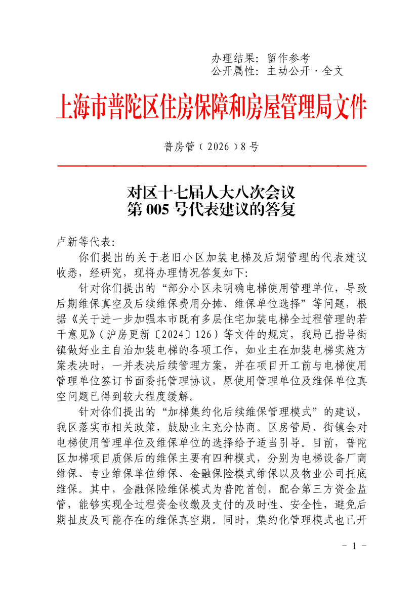 针对你们提出的“加梯集约化后续维保管理模式”的建议,我区落实市相关政策,鼓励业主充分协商。区房管局、街镇会对电梯使用管理单位及维保单位的选择给予适当引导。目前,普陀区加梯项目质保后的维保主要有四种模式,分别为电梯设备厂商维保、专业维保单位维保、金融保险模式维保以及物业公司托底维保。其中,金融保险维保模式为普陀首创,配合第三方资金监管,能够实现全过程资金收缴及支付的及时性、安全性,避免后期扯皮及可能存在的维保真空期。同时,集约化管理模式也已开始试点,由西部集团下属的曹杨物业公司负责对风荷苑、白玉新村内已加装电梯进行日常运营及维保,切实有效地发挥了其属地物业特点并兼容了加梯维保所需的专业技术及应急能力,同时还降低运维成本,下阶段将继续引导此类规模化加梯小区进一步推广该模式。