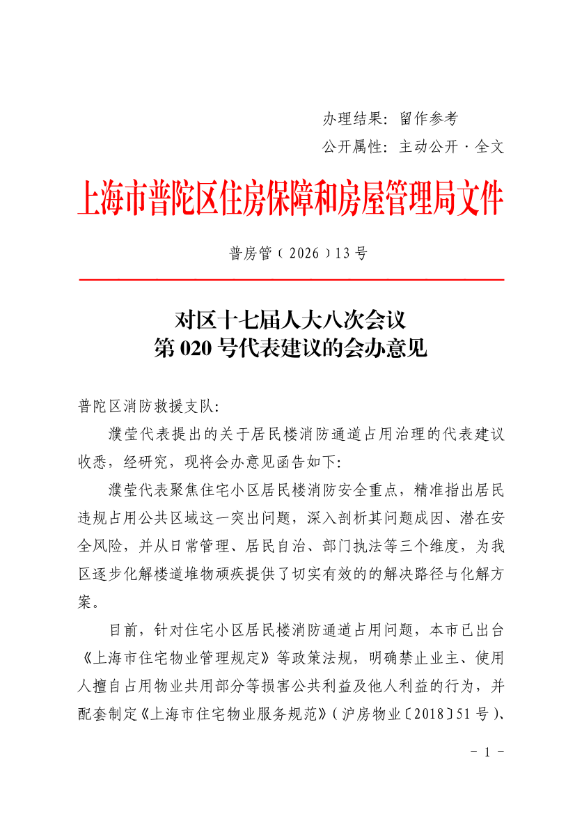针对住宅小区违规占用公共区域、楼道堆物等问题,我局将结合濮莹代表提出的意见建议,持续指导各街镇督促物业服务企业在消防、公安等监管部门的规范下积极配合居委会、业委会开展住宅小区消防安全与楼道环境治理工作,常态化进行小区每日巡查,切实守牢小区安全底线。