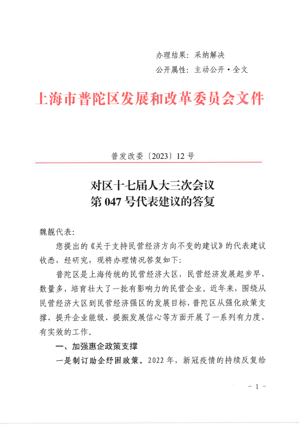 一是制订助企纾困政策。2022年,新冠疫情的持续反复给全区经济社会发展造成非常大的冲击,让很多企业尤其是中小民营企业陷入生存危机。为最大限度减少疫情的负面影响,帮助区内企业渡过难关,普陀区先后出台了“普陀新12条”“靠普十条”“稳增长八条”等一系列助企纾困政策,同步发布配套细则及行动方案共30余篇。2023年,为充分提振市场信心,推动疫后经济持续恢复,推动经济运行持续向好发展,普陀区于2月13日发布《普陀区提信心扩需求稳增长促发展的若干政策措施》,聚焦降低成本、纾困解难、稳岗留才、创新发展等方面共提出8条具体举措,以进促稳,全面助力民营企业健康发展。