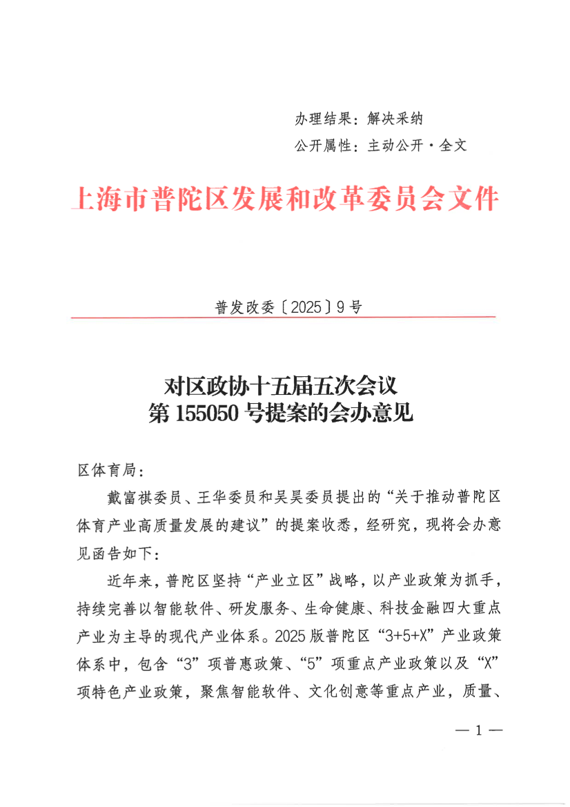 戴富祺委员、王华委员和吴昊委员提出的“关于推动普陀区体育产业高质量发展的建议”的提案收悉,经研究,现将会办意见函告如下: