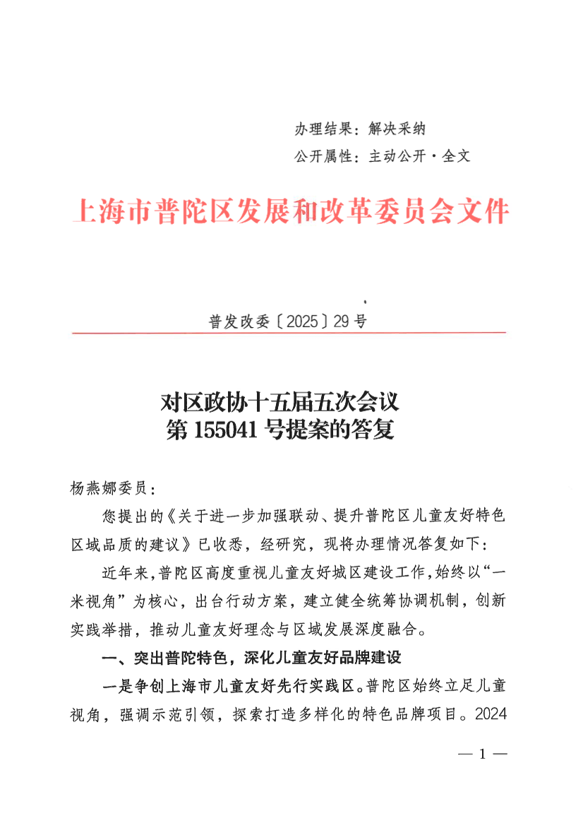 您提出的《关于进一步加强联动、提升普陀区儿童友好特色区域品质的建议》已收悉,经研究,现将办理情况答复如下: