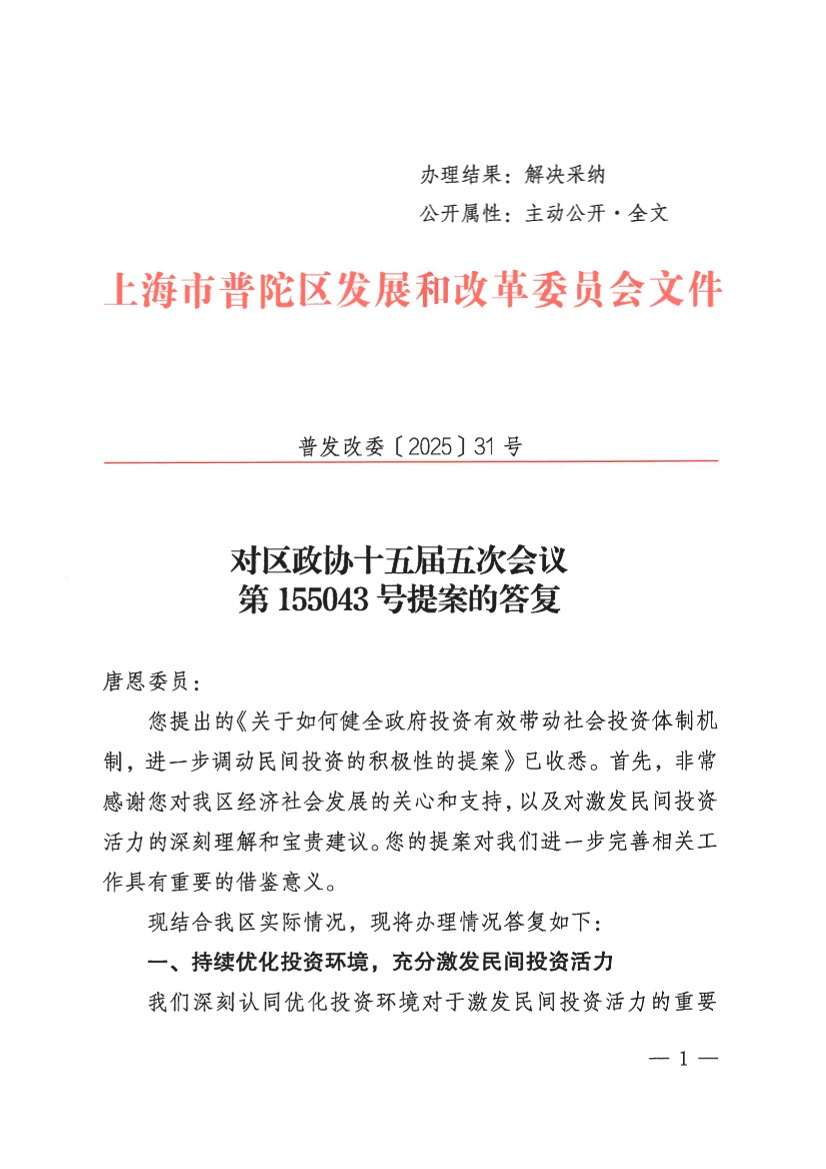 您提出的《关于如何健全政府投资有效带动社会投资体制机制,进一步调动民间投资的积极性的提案》已收悉。首先,非常感谢您对我区经济社会发展的关心和支持,以及对激发民间投资活力的深刻理解和宝贵建议。您的提案对我们进一步完善相关工作具有重要的借鉴意义。