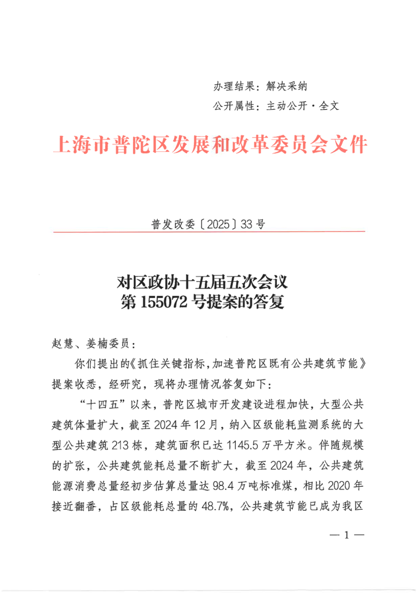 你们提出的《抓住关键指标,加速普陀区既有公共建筑节能》提案收悉,经研究,现将办理情况答复如下: