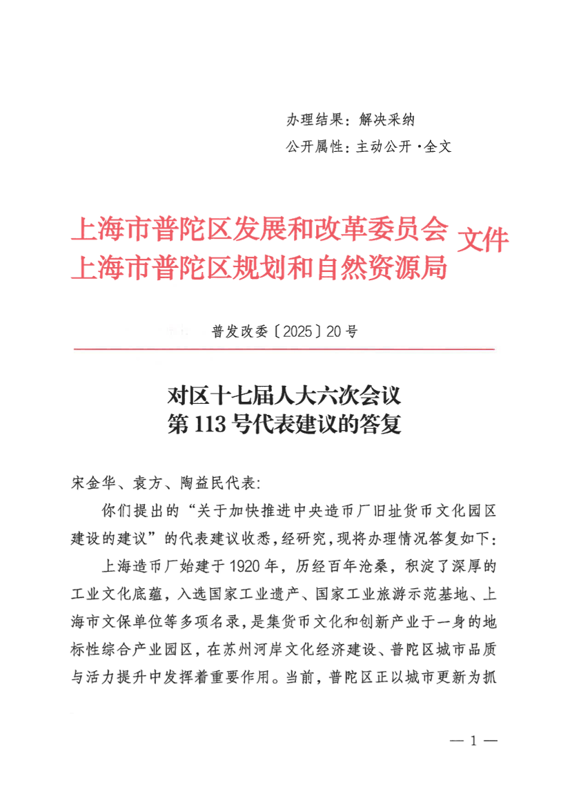 上海造币厂始建于1920年,历经百年沧桑,积淀了深厚的工业文化底蕴,入选国家工业遗产、国家工业旅游示范基地、上海市文保单位等多项名录,是集货币文化和创新产业于一身的地标性综合产业园区,在苏州河岸文化经济建设、普陀区城市品质与活力提升中发挥着重要作用。当前,普陀区正以城市更新为抓手,推动上海造币厂充分发挥工业遗产与红色文化的底蕴,传承造币博物馆文化脉络,打造形成集文化、金融、商业、休闲等于一体的综合性园区,为普陀区经济社会高质量发展注入新动能。