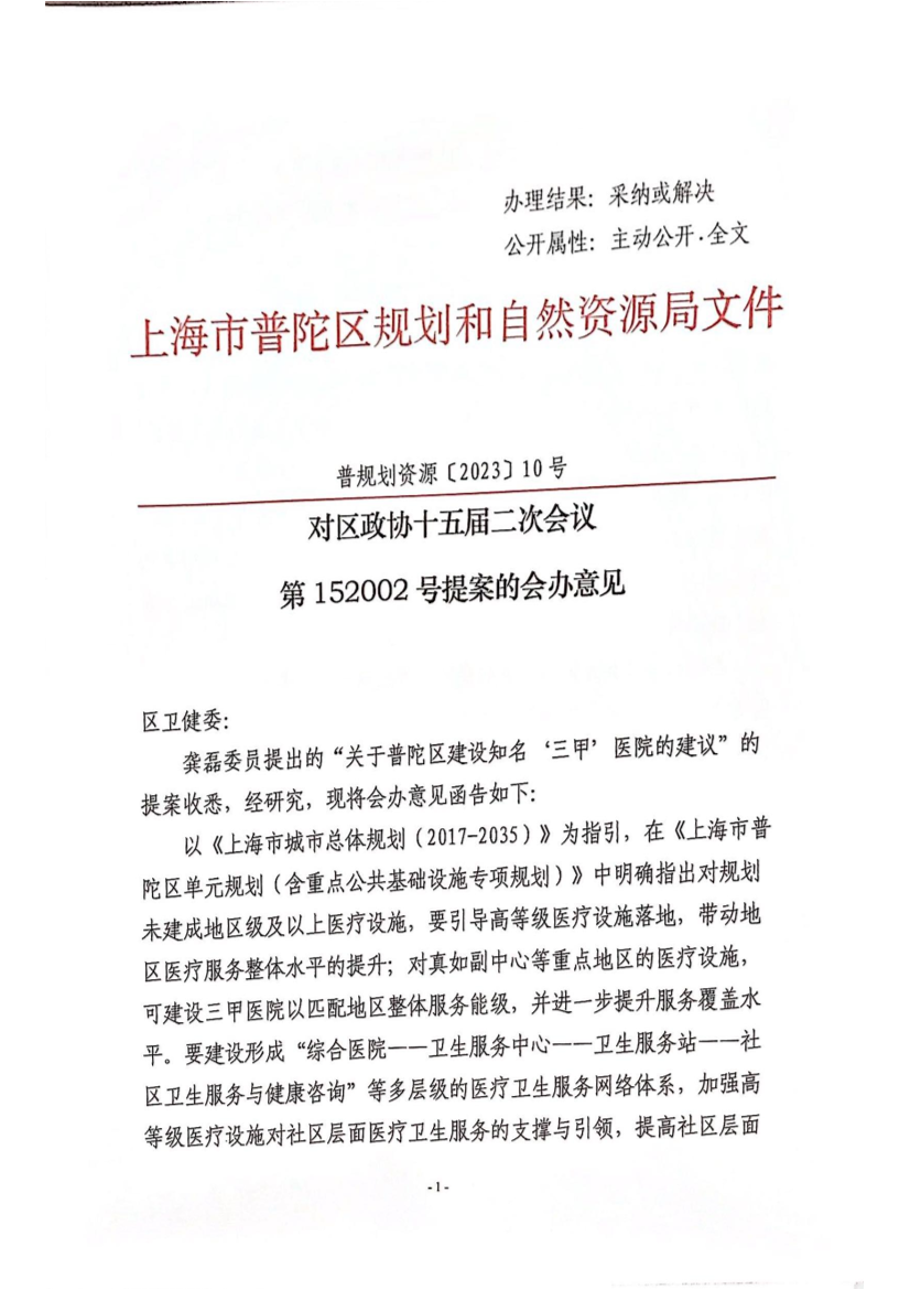 龚磊委员提出的“关于普陀区建设知名‘三甲’医院的建议”的提案收悉,经研究,现将会办意见函告如下: