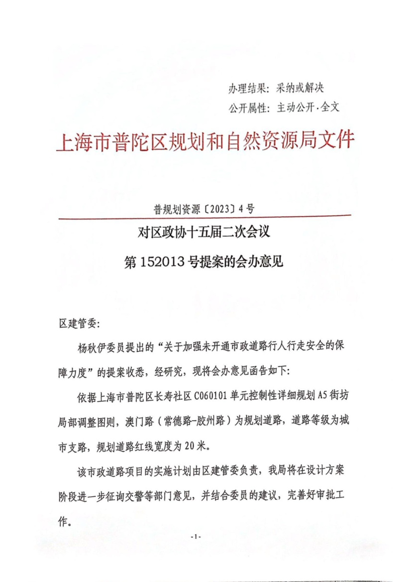 杨秋伊委员提出的“关于加强未开通市政道路行人行走安全的保障力度”的提案收悉,经研究,现将会办意见函告如下: